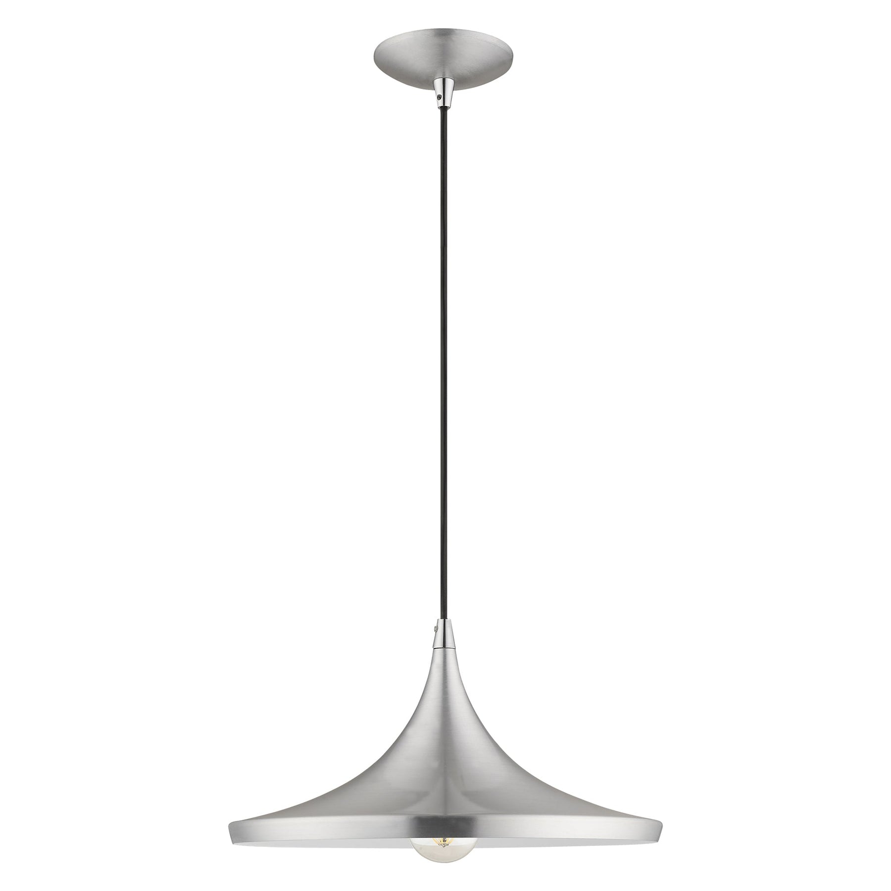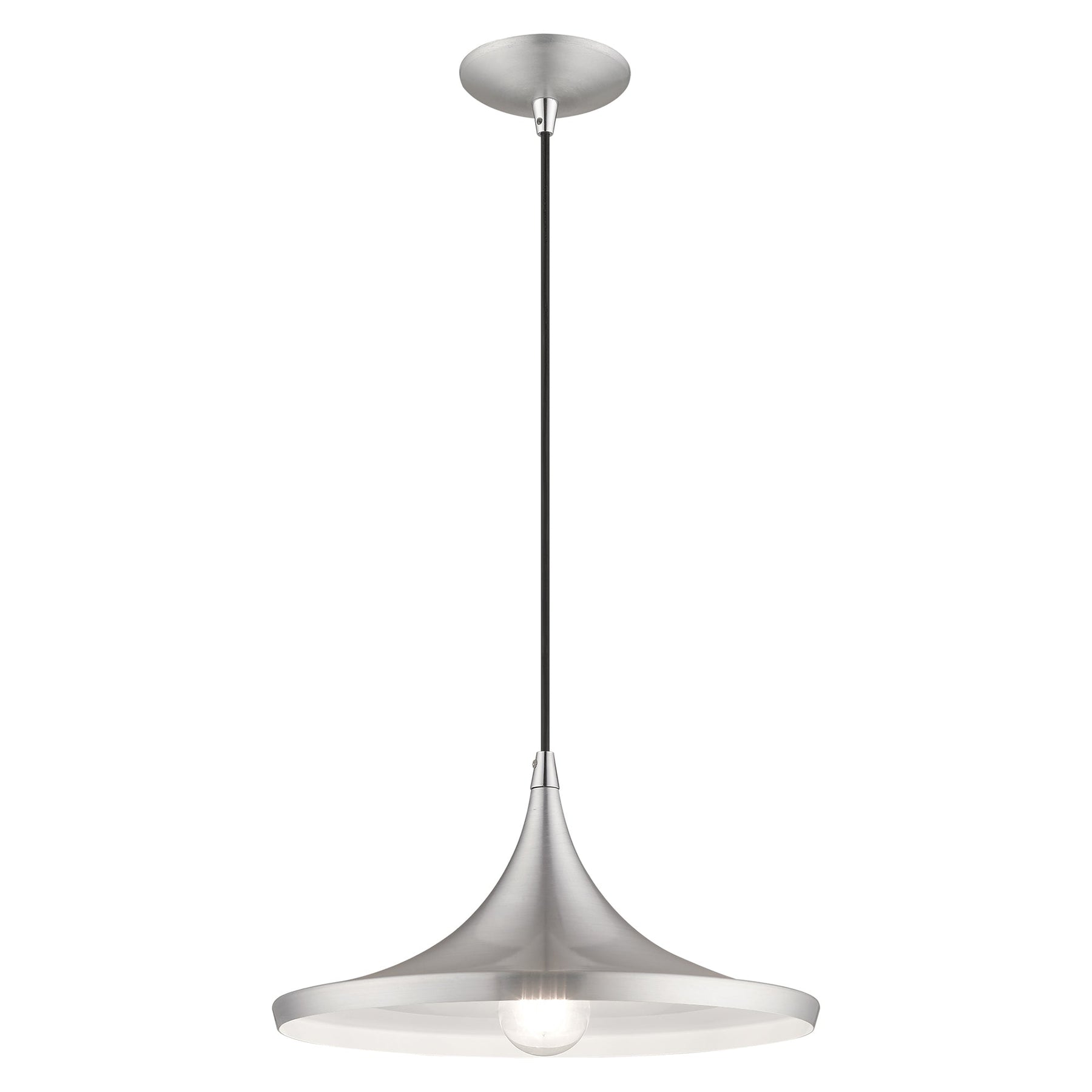The 41187-66 Metal Shade Mini Pendant combines a sleek brushed aluminum finish with a shiny white interior, making it an ideal fixture for modern decor. With an adjustable height ranging from 13 inches to 75 inches and a 14-inch diameter shade, this pendant is perfect for hanging above kitchen islands or entryways. It accommodates one medium base bulb with a maximum wattage of 60W (not included) and features a durable steel construction. Additionally, this stylish mini pendant is suitable for damp locations and comes with polished chrome finish accents, making it a versatile choice for various contemporary settings.