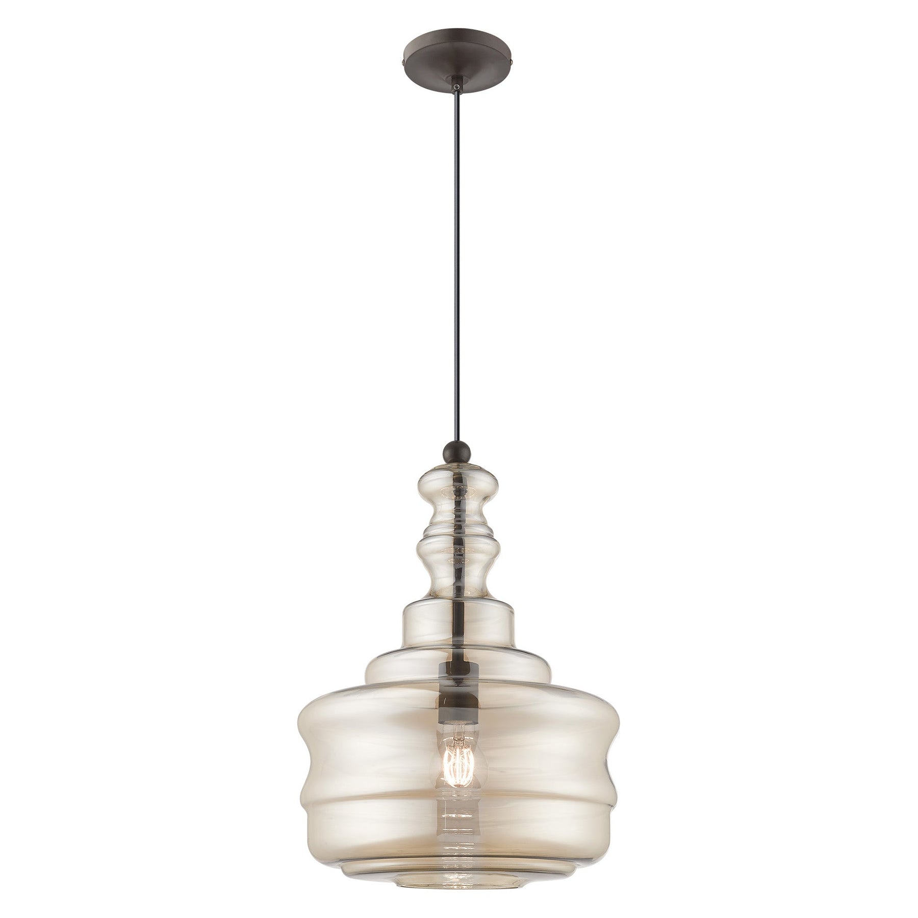 The 41225-92 Art Glass Mini Pendant is a stunning addition to any living space, showcasing a unique blend of traditional and modern styles. Crafted with exquisite hand-blown champagne glass and complemented by a rich English bronze finish, this fixture enhances your decor while providing a warm glow. With an adjustable height ranging from 19.25 inches to 90 inches and a diameter of 12.625 inches, it accommodates sloped ceilings seamlessly. Designed for use in damp locations, it requires a single medium base bulb (not included) with a maximum wattage of 60W, making it a versatile lighting solution for various settings.