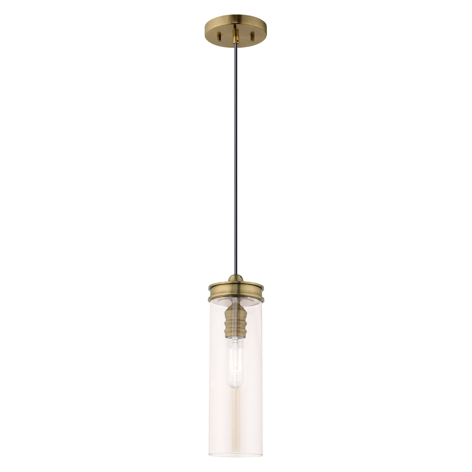 The 41227-01 Art Glass Mini Pendant seamlessly blends modern aesthetic with industrial-chic design. It features a sleek champagne cylinder-shaped glass that is elegantly suspended by stylish antique brass hardware. With an adjustable height ranging from 15 to 90 inches and a diameter of 5.125 inches, this fixture is perfect for various settings. Designed to hold one medium base bulb (not included) with a maximum wattage of 60, it is suitable for damp locations, making it a versatile choice for any space.