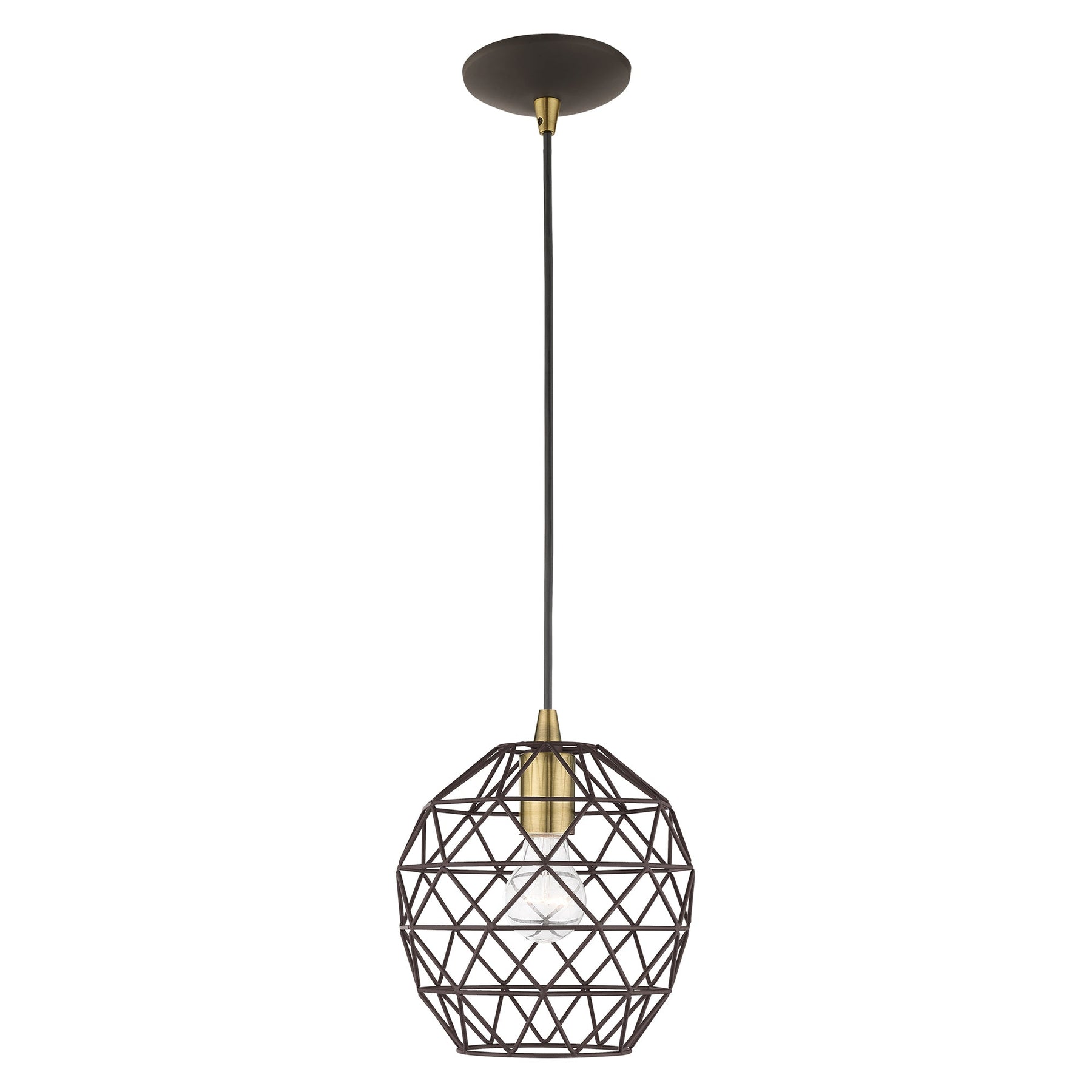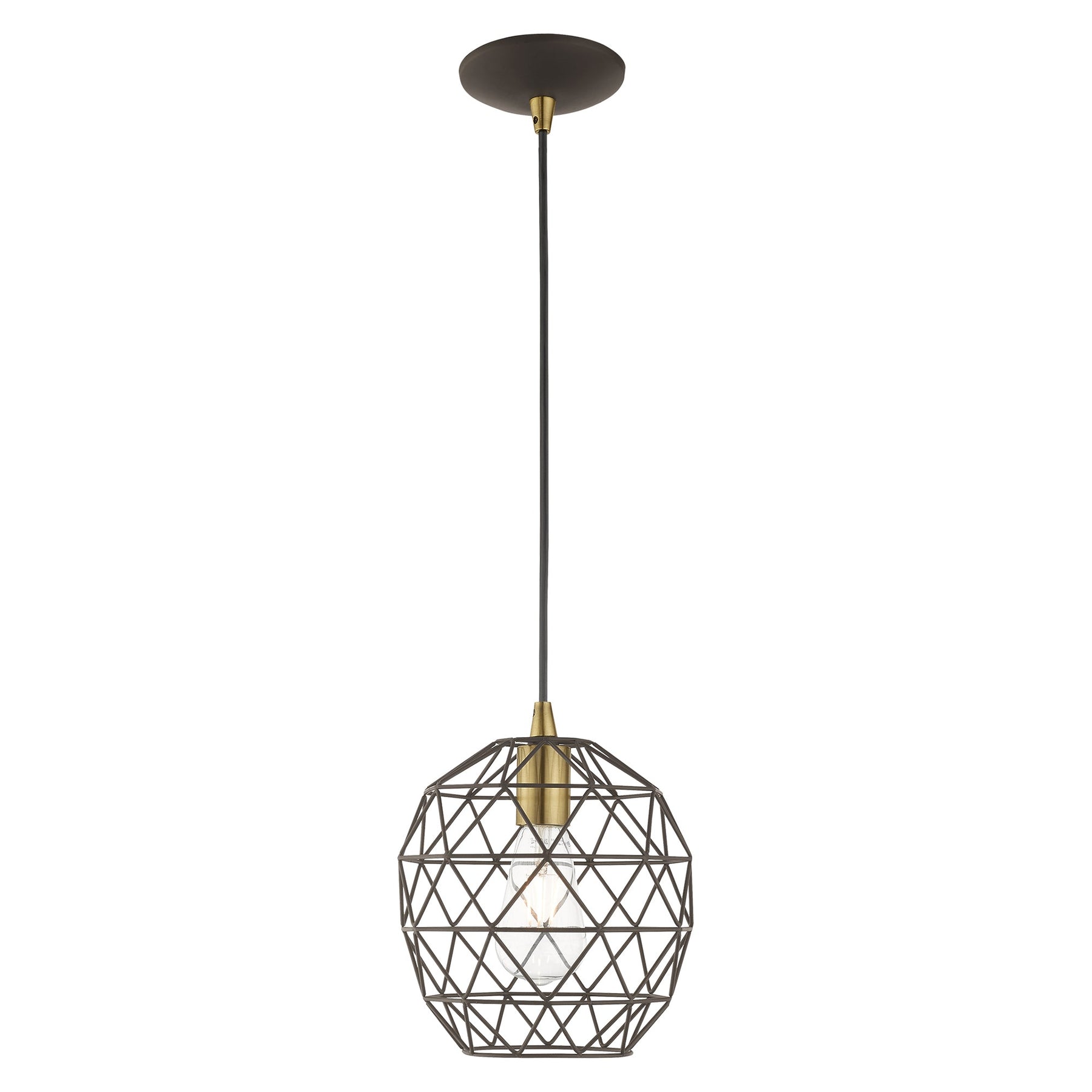 The 41326-07 Geometrix Mini Pendant in Bronze is a stunning addition for those looking to enhance their space with a contemporary flair. With a height adjustable from 13 inches to 75 inches and a diameter of 8 inches, it fits a variety of room sizes. This fixture accommodates one medium base bulb (not included) with a maximum wattage of 60W. The geometric metal shade features an elegant bronze finish with antique brass accents, offering a striking visual appeal. Additionally, it's suitable for damp locations, making it versatile for different environments.
