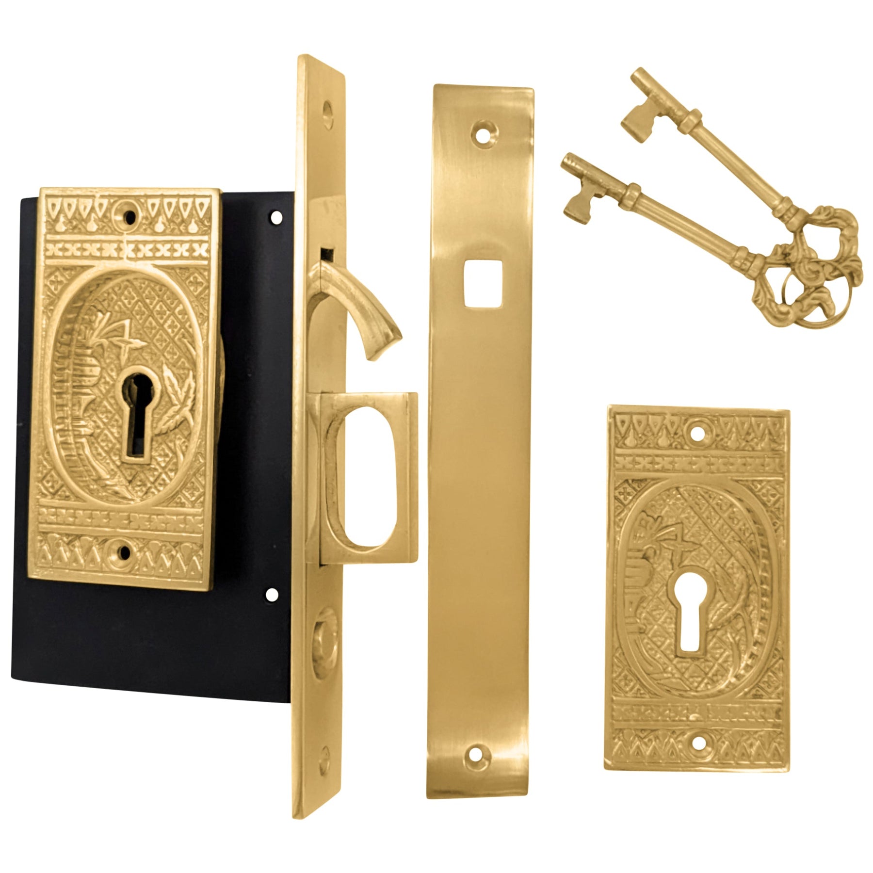 This stylish pocket door set is designed for a locking pocket door. The flush pulls are installed on either side of the door and the mortise latch/edge pull pull is installed into the side of the door to pull the door shut easily and can lock into the door jamb. Locking systems require doors with at least 1 3/4'' thickness. This pattern is called "Broken Leaf" and features a classic earlier twentieth century pattern that emphasized more geometric shapes and a carved design. The lock boxes measure approximately 3 1/4 inches deep (including lip) and 5 1/8 inches high. The lock has a 2 inch backset. Works with a standard skeleton key and comes complete with an ornate set of skeleton keys. The average lead time for this particular product is 20 weeks depending upon the finish chosen.