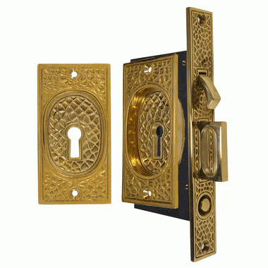 Arts & Crafts Pattern Single Pocket Privacy (Lock) Style Door Set (Polished Brass) - this set is a designed for a locking pocket door (such as a bathroom or study door). The flush pulls are installed on either side of the door and the mortise latch/edge pull pull is installed into the side of the door to pull the door shut easily and can lock into the door jamb. Locking systems require doors with at least 1 3/4'' thickness.