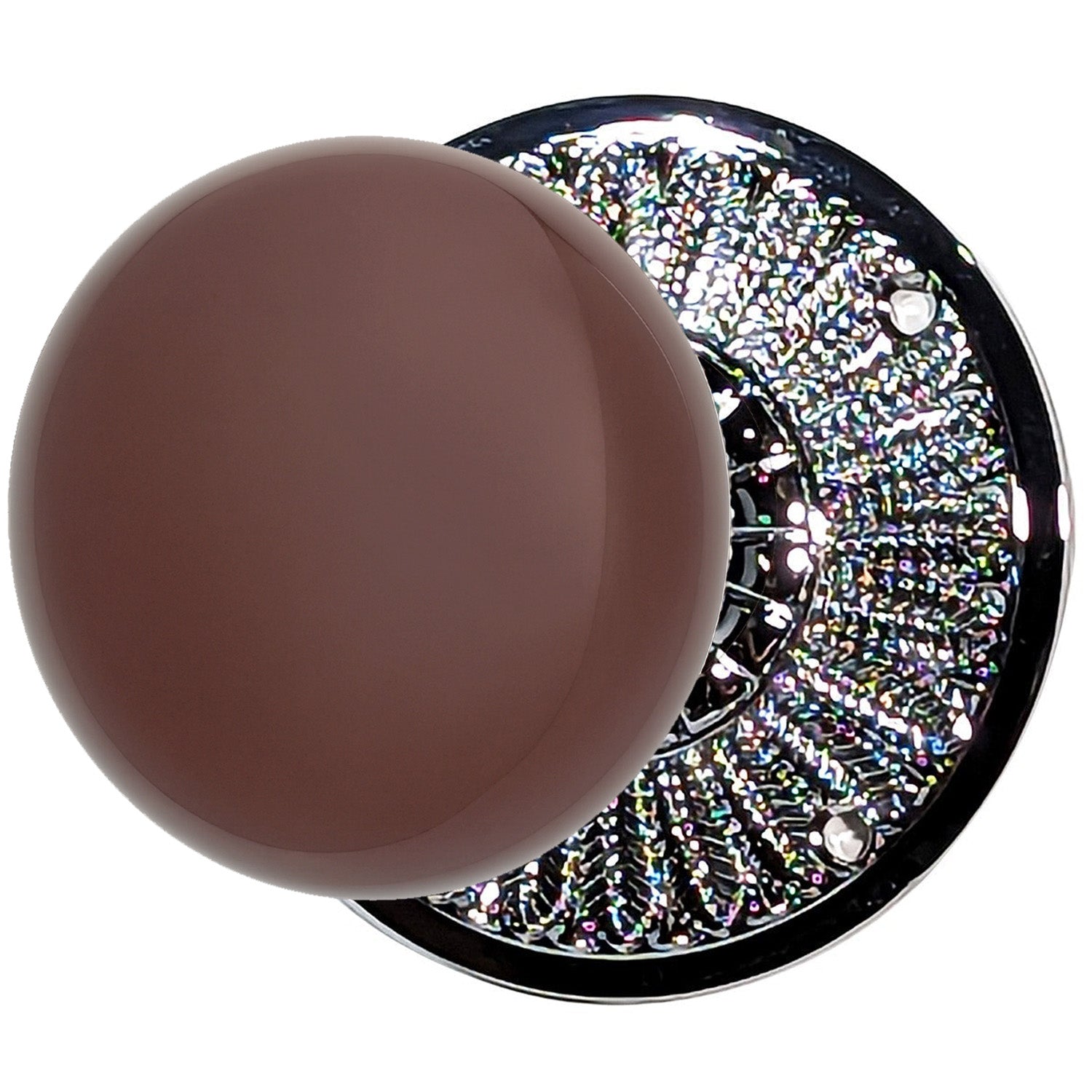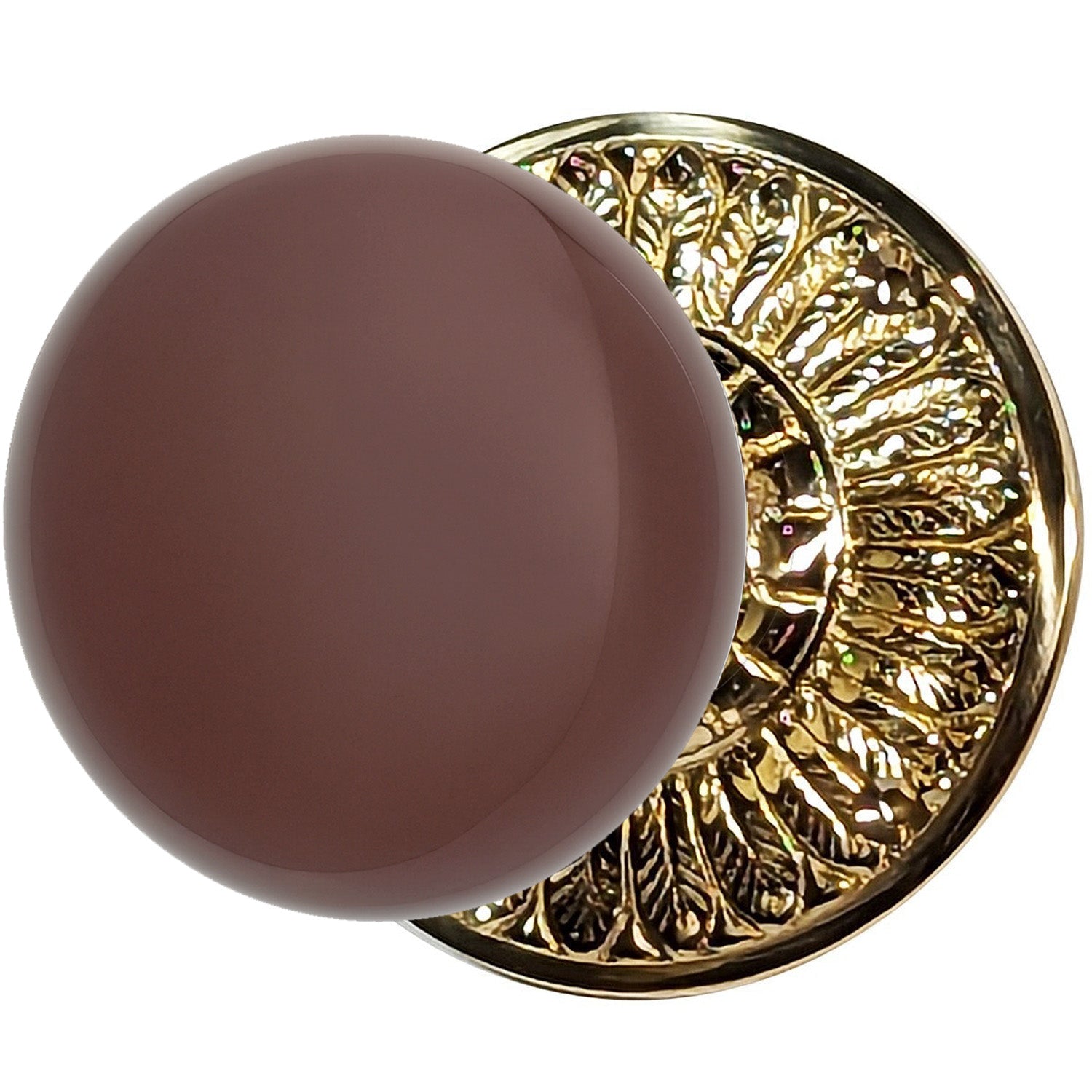 Brown Porcelain Door Knob with Brass Feathers Rosette - The genuine brown porcelain and measures 2 3/8 inches in diameter (approximate) and has a projection of 2 1/4 inches. Solid brass rosette plates screws directly into the door with three wood screws and measures 3 1/8 inches in diameter.