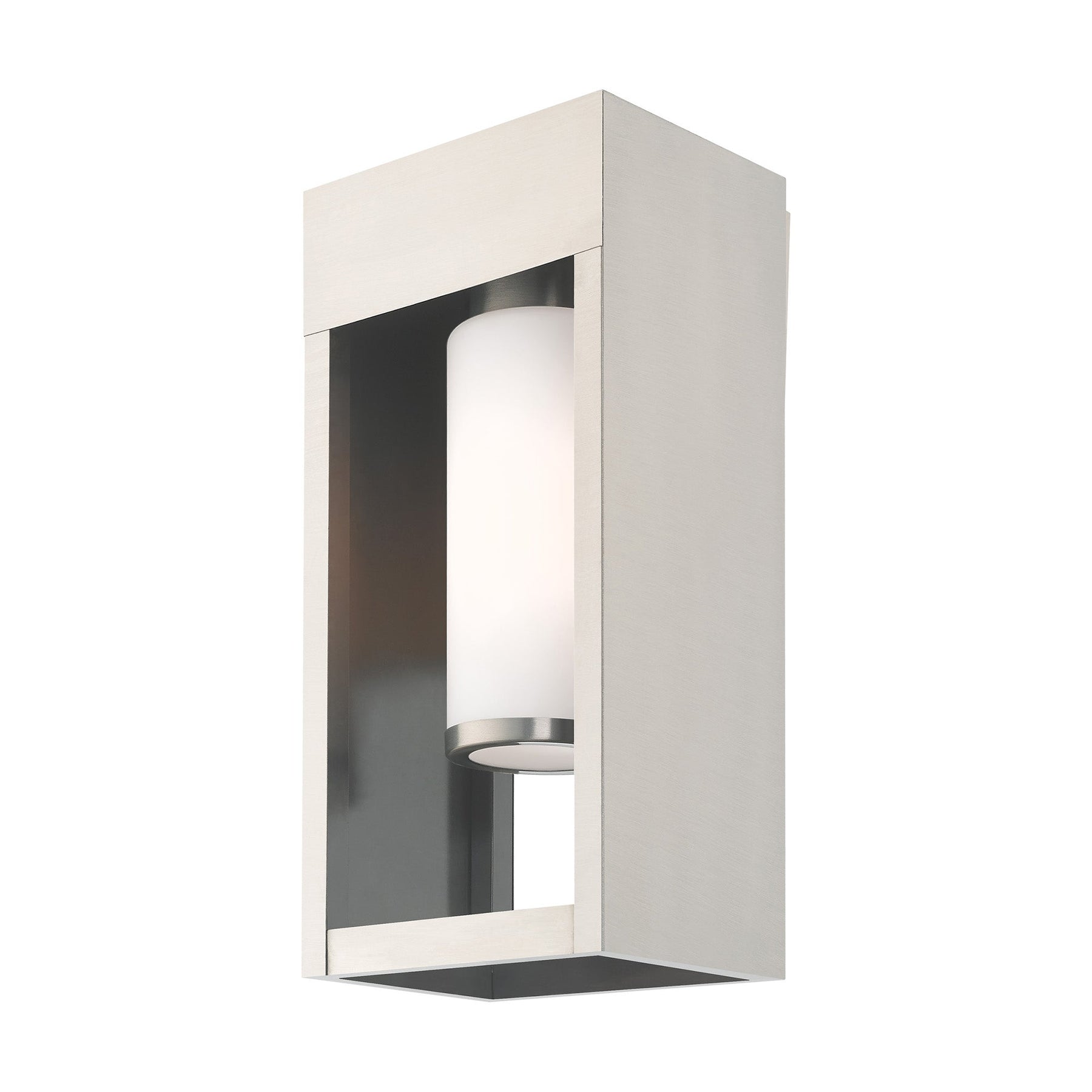 The Bleecker Outdoor Wall Lantern, model number 20982-91, combines sturdy craftsmanship with a contemporary design. Made from solid brass and finished in brushed nickel, this lantern features a hand-blown satin opal white cylinder glass shade, offering a sleek look. Measuring 6.25 inches in width and 13.625 inches in height with a 5.625-inch extension, it accommodates one medium base bulb with a maximum wattage of 60W. Rated for both damp and wet locations, this fixture is perfect for adding stylish illumination to outdoor spaces.