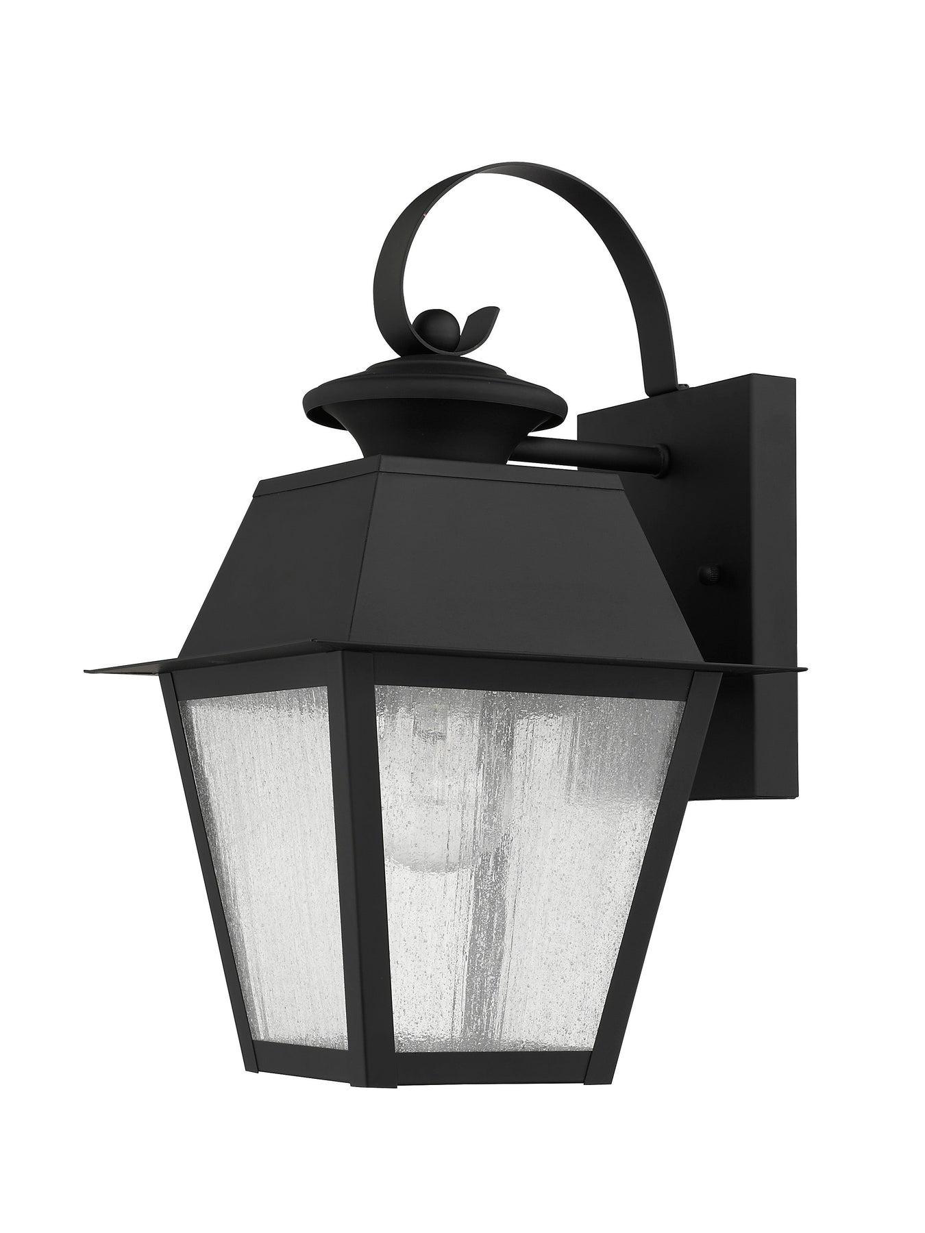The Mansfield Wall Lantern, item number 2162-04, is a stunning addition to any outdoor space, combining traditional elegance with practical design. Measuring 7.5 inches in width and 12.5 inches in height, this wall sconce features a sleek black finish and is crafted from hand-made solid brass. The beautiful seeded glass shade enhances the light's diffusion, while the fixture accommodates one medium base bulb with a maximum wattage of 100W (bulb not included). With an 8.5-inch extension, it is perfect for illuminating driveways, porches, or entryways. This lantern is rated for both damp and wet locations, making it highly suitable for various outdoor settings.