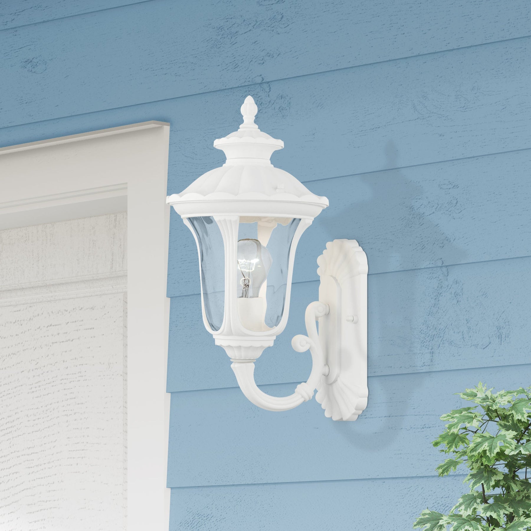 The 7850-13 Oxford Outdoor Wall Lantern is a charming addition for those desiring a touch of traditional elegance. This fixture features a textured white finish and showcases a single upward-facing light design, requiring one medium base bulb with a maximum wattage of 100W (bulb not included). With a width of 7.25 inches and a height of 15.5 inches, it has an 8.75-inch extension, making it ideal for various outdoor settings. Crafted from durable aluminum and adorned with hand-blown clear water glass, this lantern is suitable for both damp and wet locations, enhancing the curb appeal of any home with its vintage charm.