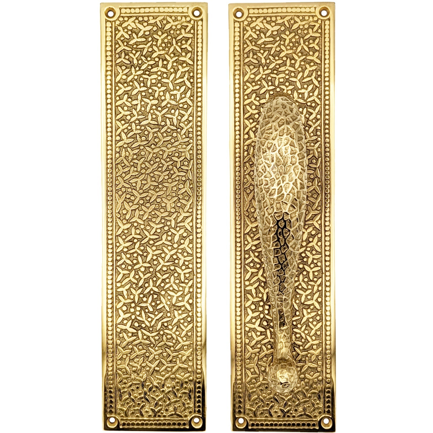The Rice Pattern is a distinctive and ornate pattern that gained popularity during the 19th century. This intricate pattern features a design reminiscent of grains of rice originally made by Yale and Town of Stamford, Connecticut. The solid brass construction not only ensures durability but also adds a touch of timeless sophistication to your pocket door sets. With its stylized leaves and intentional breaks, this hardware seamlessly blends historical charm with contemporary functionality.