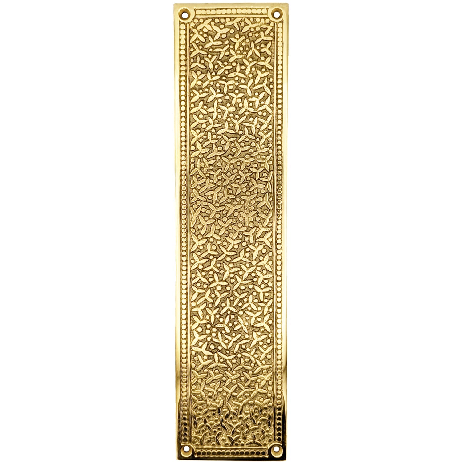 This Push Plate measures 12 inch tall and 3 inch wide. Solid brass construction allows for decades of service. Comes complete with mounting hardware. Also available in Polished Brass, Lacquered Brass, and Antique Brass.