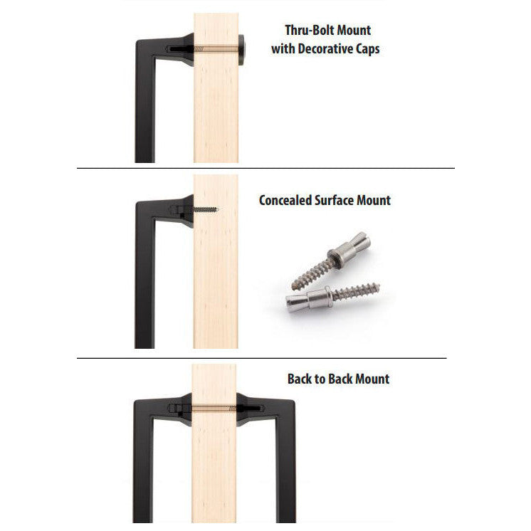 13 3/4 Inch Sandcast Bronze Rod Pull - this door pull is constructed from solid brass and measures 13 3/4 inches end-to-end by 3/4 inches wide. Its projection is 2 9/16 inches and its center-to-center measurement is 12 inches. It has a base diameter of 1 3/4 inches. Comes in a variety of finishes, including Medium Bronze and Flat Black Bronze. Comes complete with mounting hardware specific to the mounting style you choose from the diagram.
