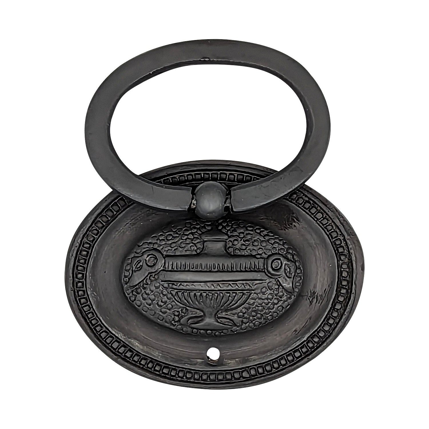This ring pull measures 2 7/8 inches long and 2 1/8 inches tall. Comes complete with one rear mount machine screw. This oval bail pull is made in the Hepplewhite and Federal (Federalist) style and it is available in several finishes. Comes complete with mounting hardware.