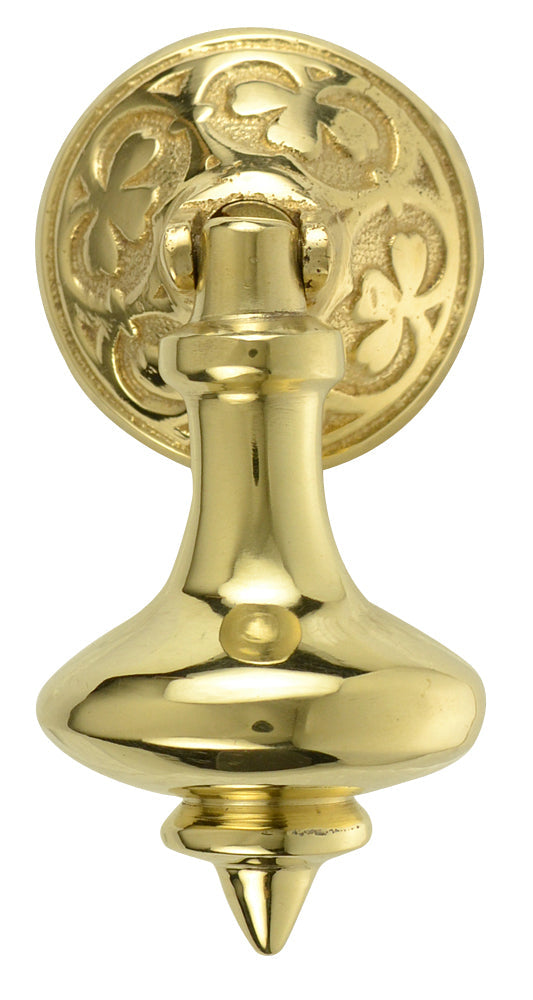 Measures 3 inches long with a 1 5/8 inch backplate. Fine detailing with this elegant drop pull. Comes complete with the mounting hardware. This pull is perfect for the Jacobean style and it is available in several finishes including polished brass, antique brass, Black Bronze, polished chrome and Satin Nickel.
