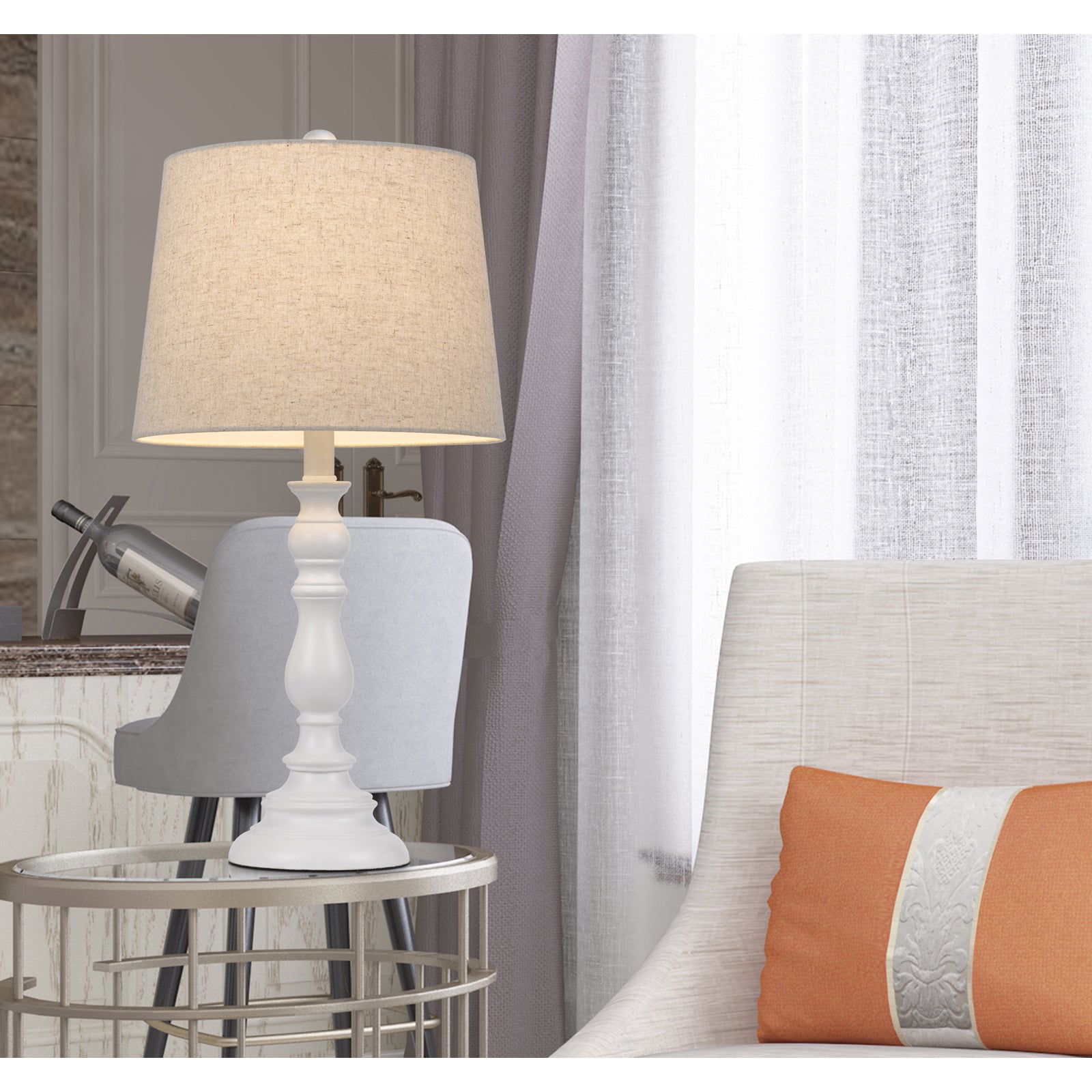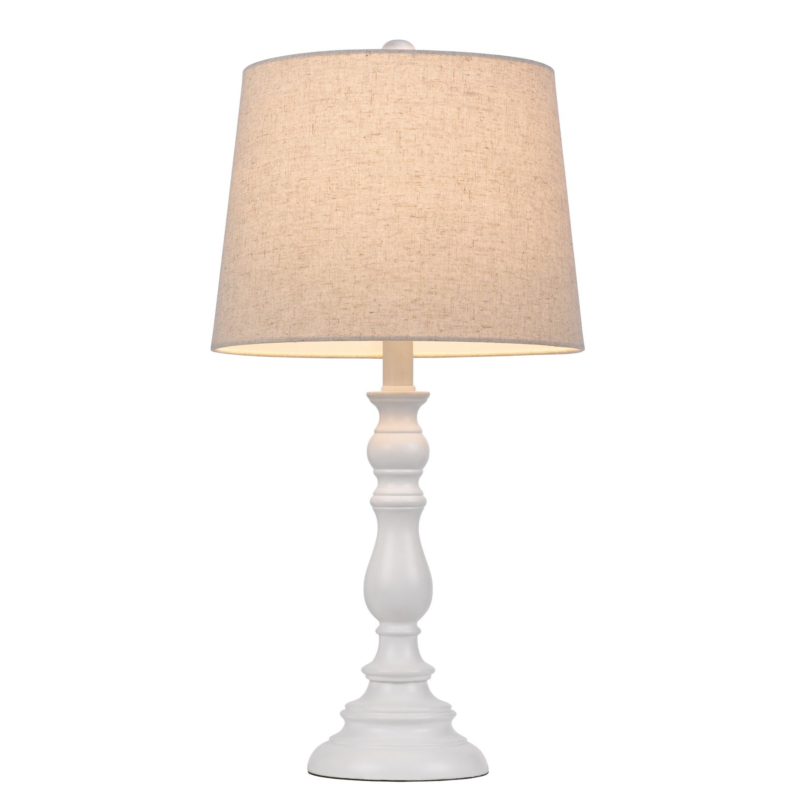 The BO-3096TB-2 Chester table lamp set features a traditional design, perfect for adding elegance to your space. Constructed from durable white resin, these lamps include two hardback taper drum fabric shades, each requiring a standard E26 bulb with a maximum wattage of 60W. The thin candlestick-style body enhances their classic charm, making them ideal for console tables or buffet displays. Each lamp is shipped in one carton, with assembly required, and is backed by a one-year warranty against defects in material and workmanship.