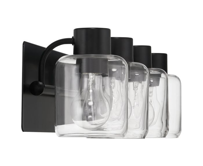 The Rori 4 Light Vanity in Flat Black offers a perfect blend of transitional style and practical functionality. Designed with clear glass shades suspended from elegantly arched arms, this vanity light requires four medium base 60 watt bulbs (not included). Measuring 28.25 inches in width and 6.50 inches in height, it features a 6.75-inch extension and a backplate depth of 0.91 inches, making it suitable for various spaces. Damp rated for use in humid environments, it's ideal for bathrooms. The fixture comes with a one-year limited warranty for added assurance.
