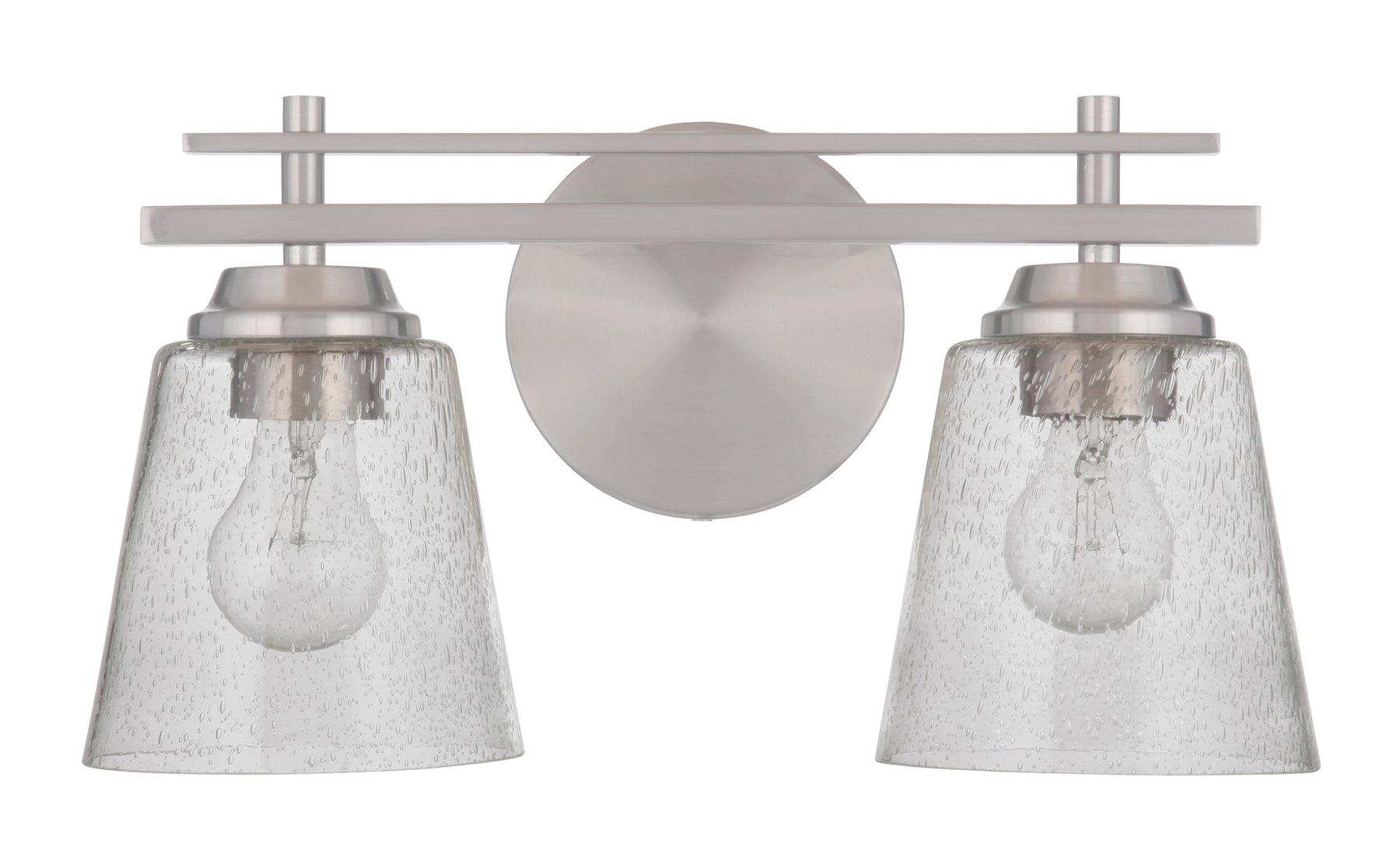 The Drake 2 Light Vanity in Brushed Polished Nickel is an elegant addition to both transitional and traditional spaces. Featuring a distinctive double rail silhouette and clear seeded glass globes, this vanity light is designed to create a stunning visual effect. It requires two medium base A19 bulbs with a maximum wattage of 60W each (bulbs not included) and has dimensions of 15.50 inches in width and depth, with a height of 8.50 inches and a 7.88-inch extension. The fixture is wall-mounted and damp rated, making it suitable for use in humidity-prone areas.