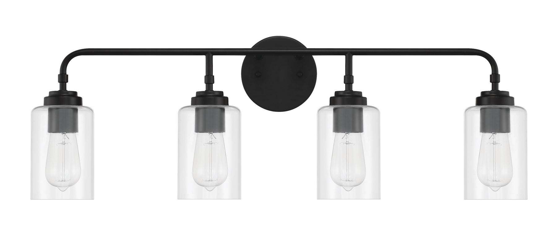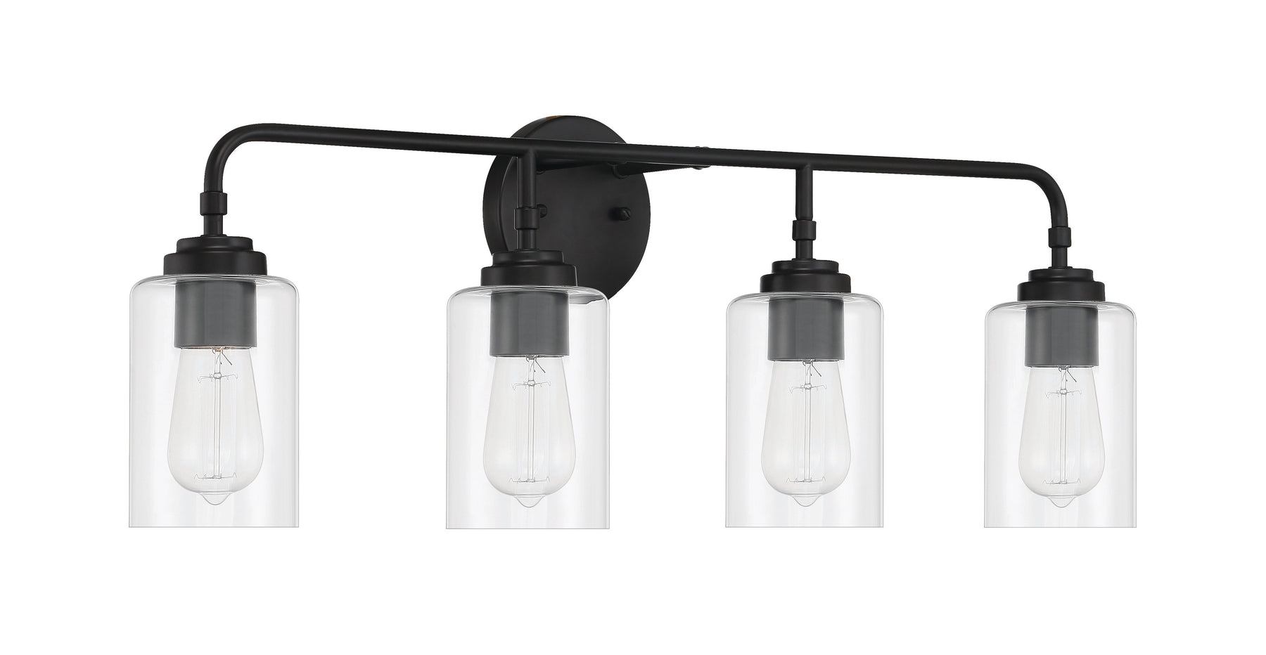 The Stowe 4 Light Vanity in Flat Black combines stylish design with functional lighting, making it a perfect addition to your bathroom. This elegant vanity fixture requires four medium base A19 bulbs with a maximum wattage of 60W each (bulbs not included). With dimensions of 31.13 inches in width, 31.13 inches in depth, and 10.75 inches in height, this wall-mounted light is damp rated, ensuring it's suitable for humid environments. The clear glass shades enhance the overall aesthetic, while the flat black finish provides a modern touch to any decor.