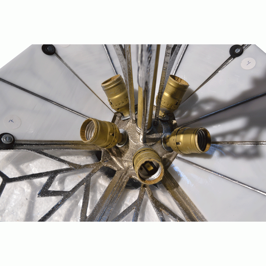 This uses five bulbs (maximum of 50 Watts each) and this fixture comes complete with the mounting hardware. Each chandelier has seven custom made stained glass panels and the stained glass comes in Amber (shown), Pink Champagne, and Deco Green.