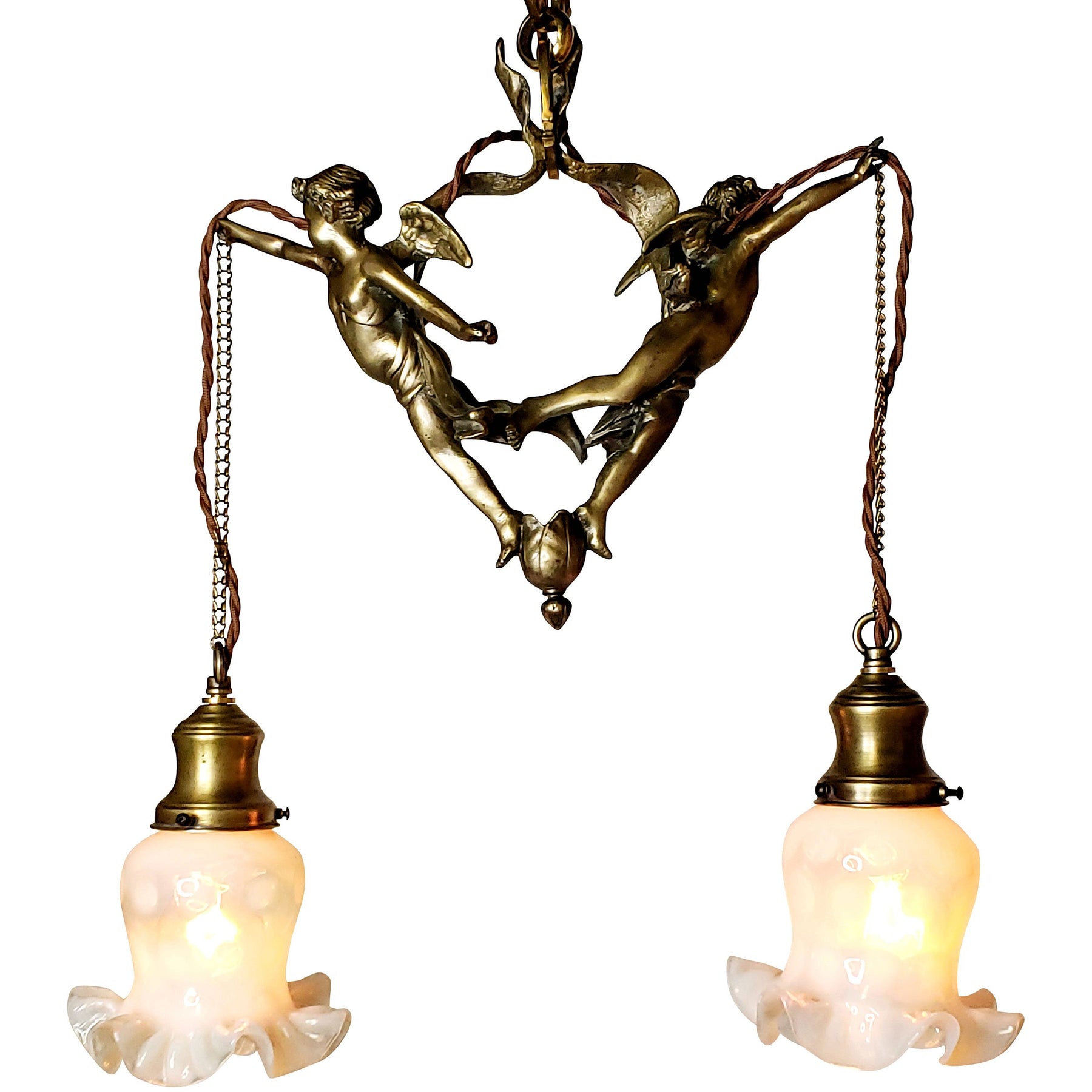 This stunning antique reproduction light is made by hand with incredible detail. It is constructed and assembled in Michigan. The Cherub lamp has two lights - and it is available in several shade options. The height of the Cherub chandelier is approximately 22 inches (not including the additional 24 inches of chain). This chandelier has a width of 14 inches not including the shades.
