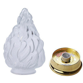 Glass Flame Light Fixture (Polished Brass Finish) - This light fixture includes the glass flame shaped shade and the polished brass base. Glass shade measures 10 inch tall by 6 1/2 inch wide. Solid brass base measures 1 5/8 inch tall by 5 inch in diameter. This fixture comes pre-wired and ready to install. U.L. approved and this comes with the crossbar, wire nuts, thumb screws and includes high heat porcelain socket. This fixture accepts one (1) standard bulb 60 Watt maximum. This fixture uses a 4 inch fitter shade (included as shown) and has a maximum ceiling cover of 5 inches in diameter.