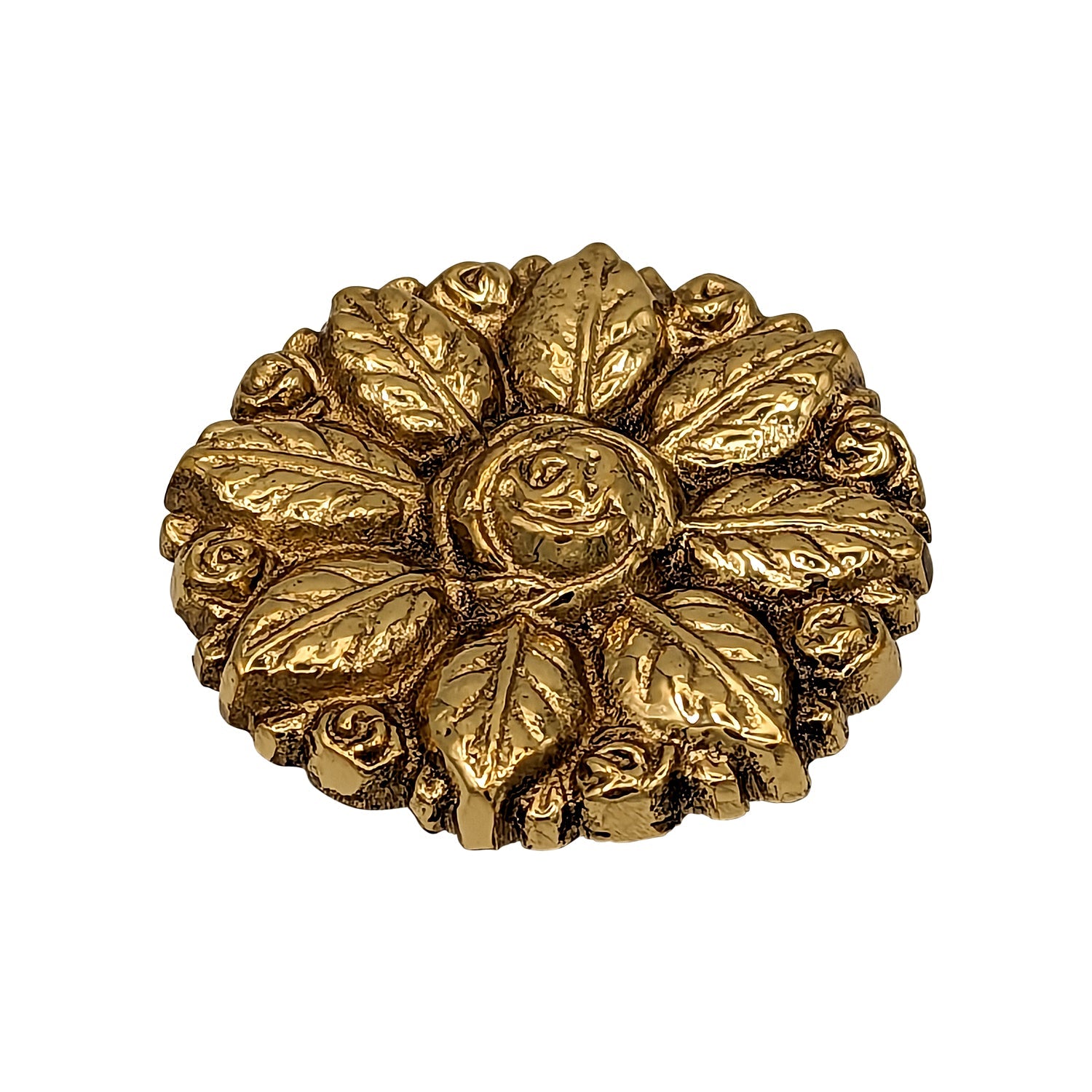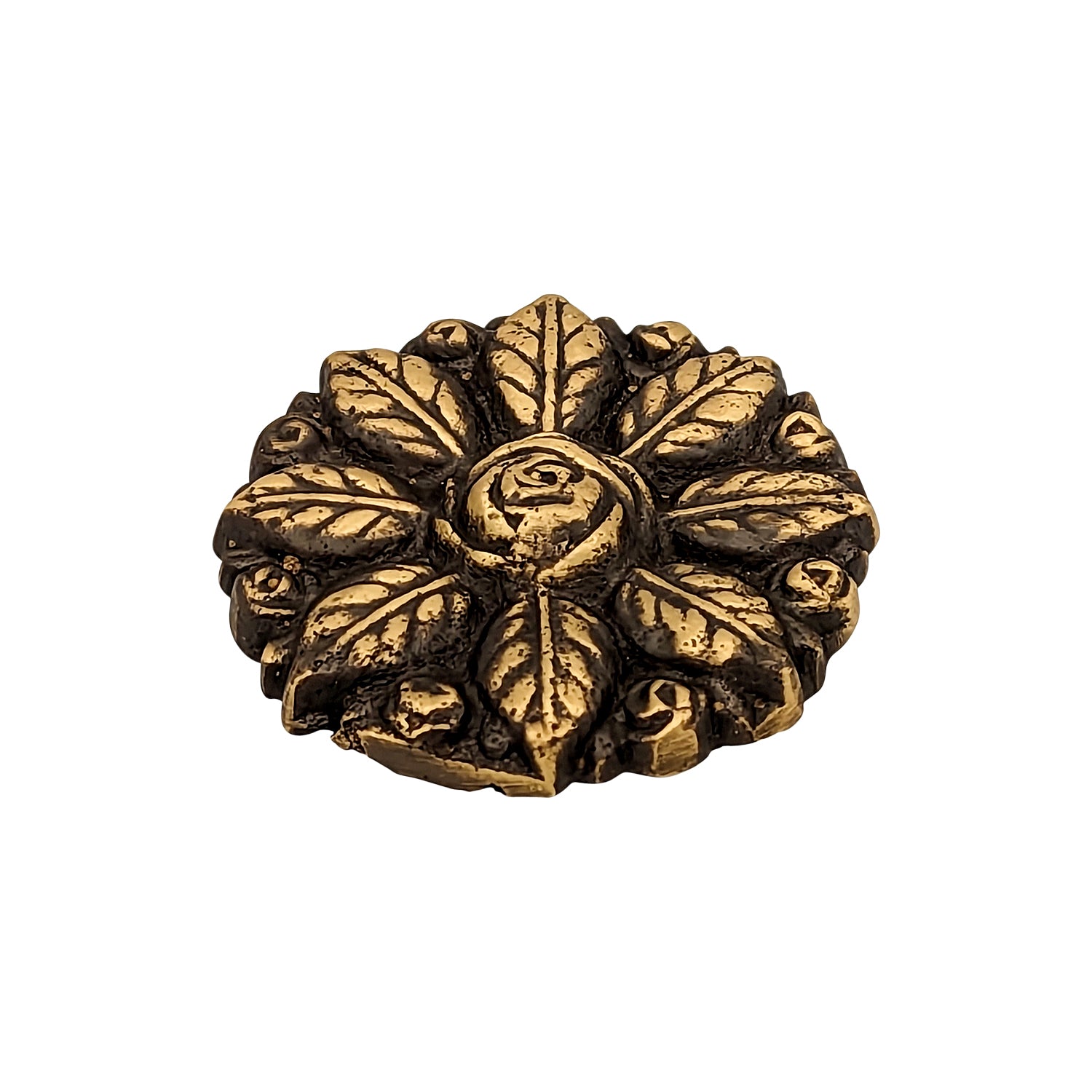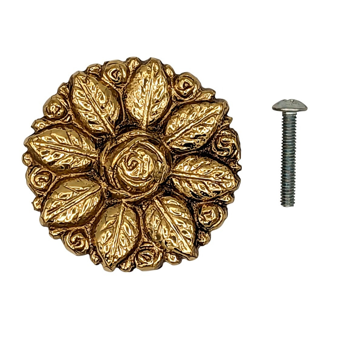 This knob features a rose design and has a diameter of 2 1/8 inches with a projection of 0.95 Inches. It comes complete with all mounting hardware. It is available in a variety of finishes. This particular product has a lead time of approximately 1 to 3 business days.
