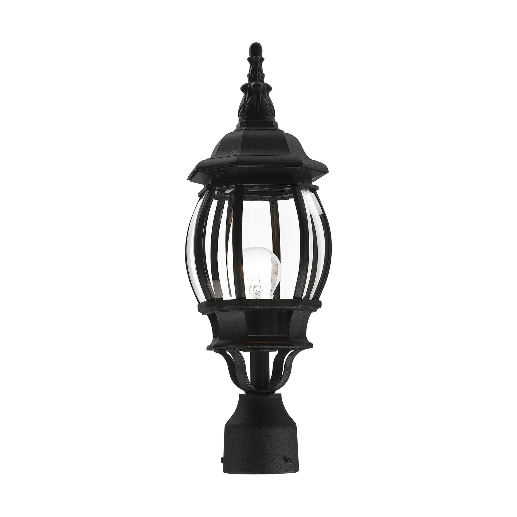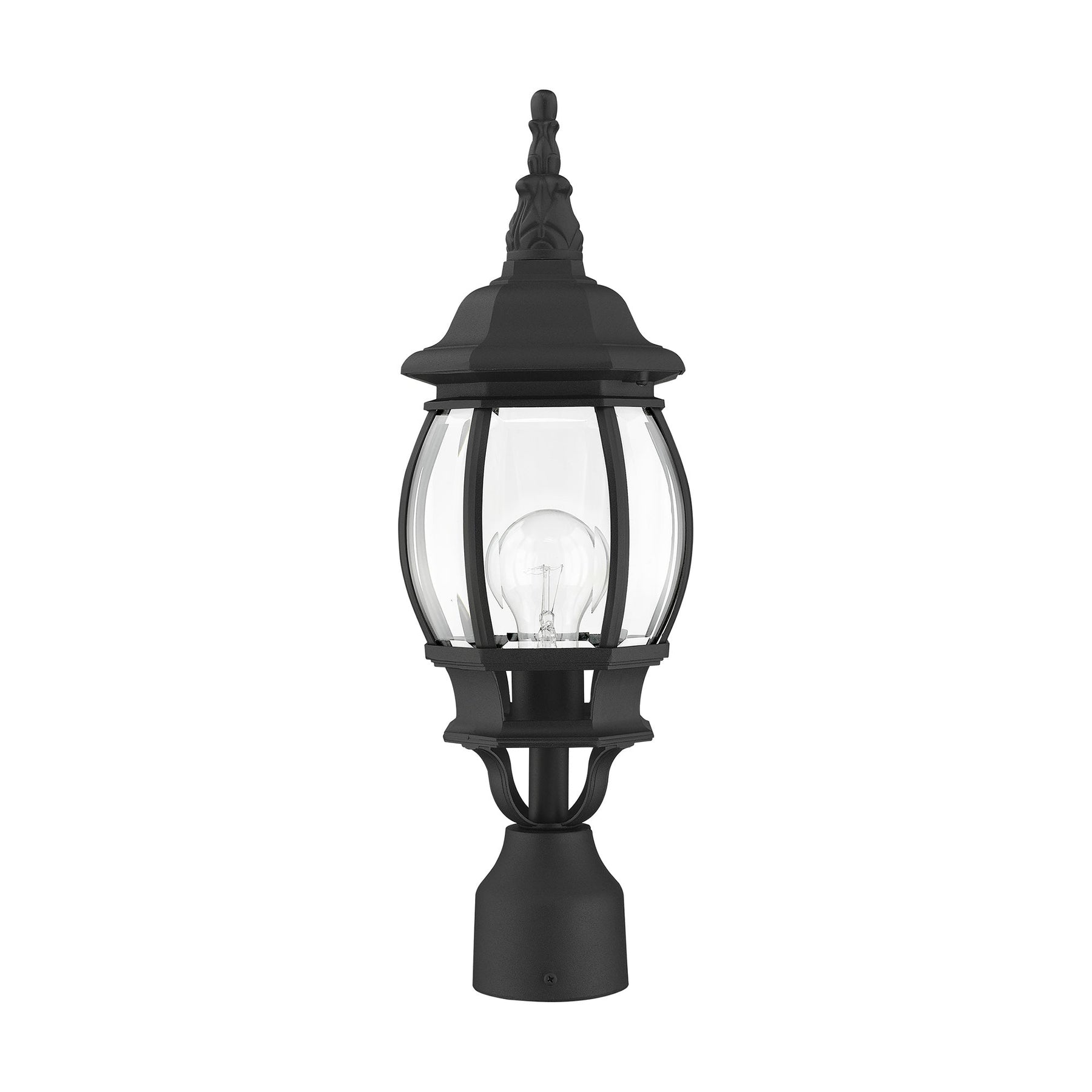 The 7522-14 Frontenac outdoor post top lantern is a stunning addition for those who appreciate classic and timeless design. Crafted from durable aluminum with a sophisticated textured black finish, this fixture features a clear beveled glass shade that enhances its ornamental details. With a height of 19.5 inches and a diameter of 7 inches, it accommodates one medium base bulb with a maximum wattage of 100W (bulb not included). This lantern is rated for both damp and wet locations, making it ideal for various outdoor settings, while its traditional and colonial style elevates any home's exterior.