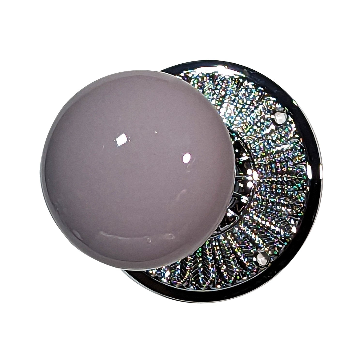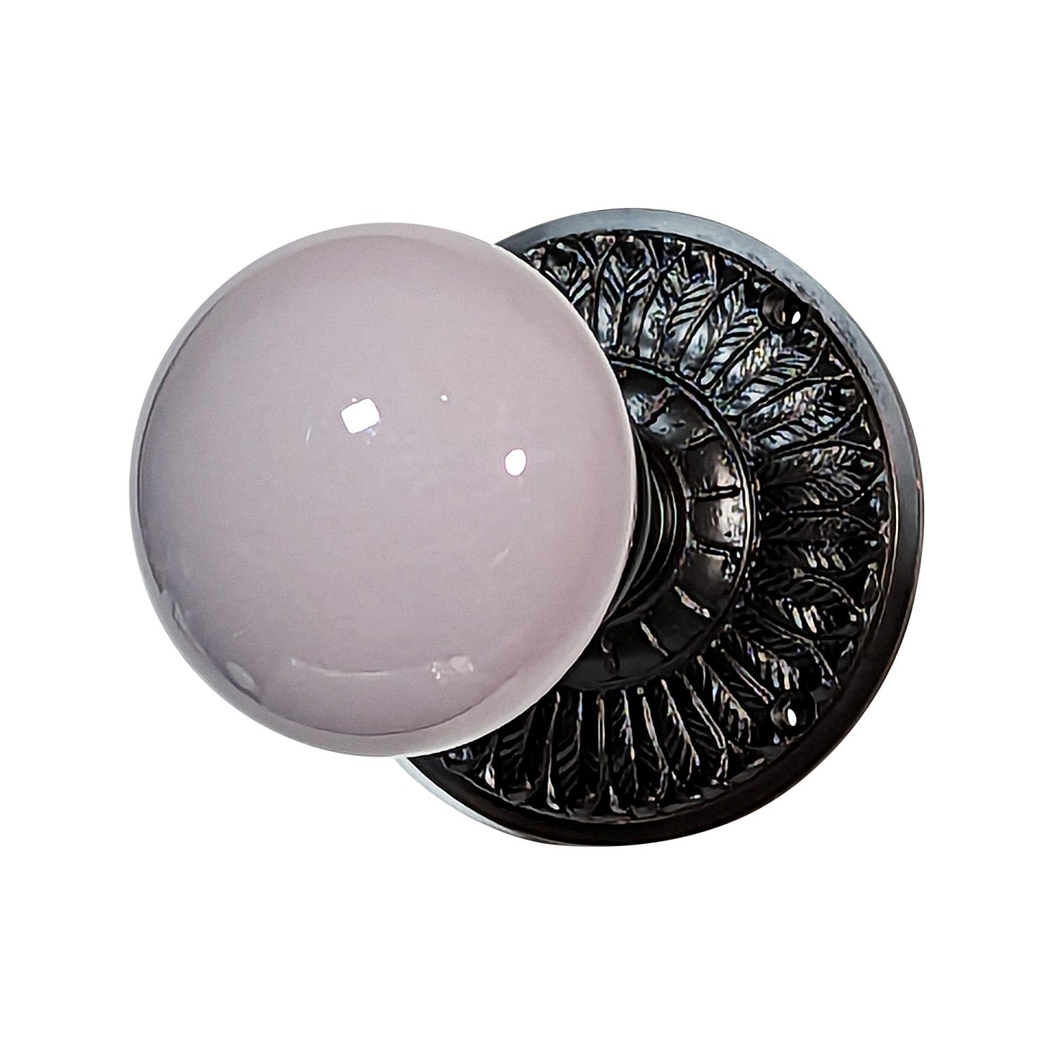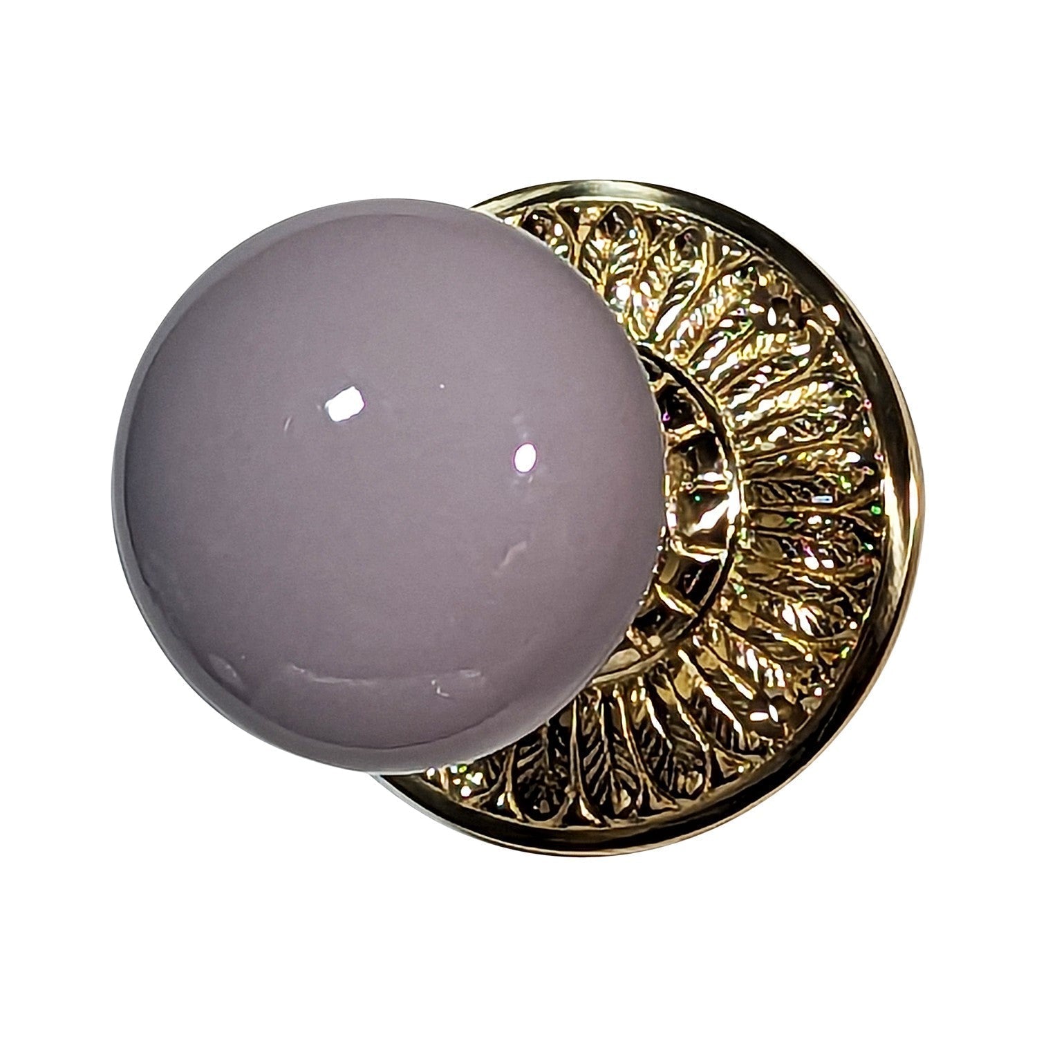 Grey Porcelain Door Knob with Brass Feathers Rosette - The genuine grey porcelain and measures 2 3/8 inches in diameter (approximate) and has a projection of 2 1/4 inches. Solid brass rosette plates screws directly into the door with three wood screws and measures 3 1/8 inches in diameter.